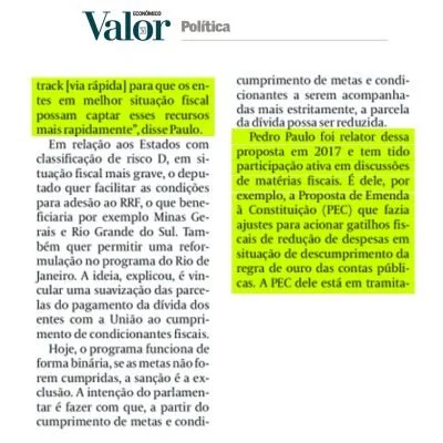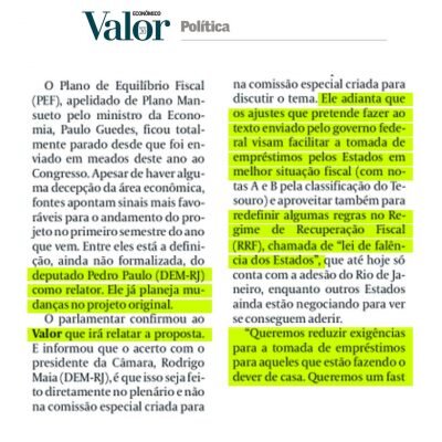 Agora, serei o relator do Plano de Equilíbrio Fiscal (PEF), ou Plano Mansueto – PLP 149/2019 – como ficou conhecido, um programa para financiamento feito pra os 13 Estados com rating “C”, mas condicionado a ajuste nas contas para elevar sua categoria para “A” ou “B”