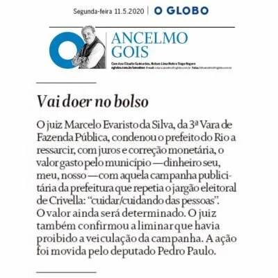 O Ancelmo Gois deu hoje em sua coluna no Jornal O Globo, a sentença dada pelo juiz Marcelo Evaristo da Silva, da 3ª Vara de Fazenda Pública, que condenou o prefeito Marcelo Crivella. Em 2017, entrei com uma ação contra o Crivella, por ele ter usado nas propagandas da Prefeitura, a expressão “cuidando das pessoas”, o mesmo slogan que ele usou durante a campanha de 2016.
