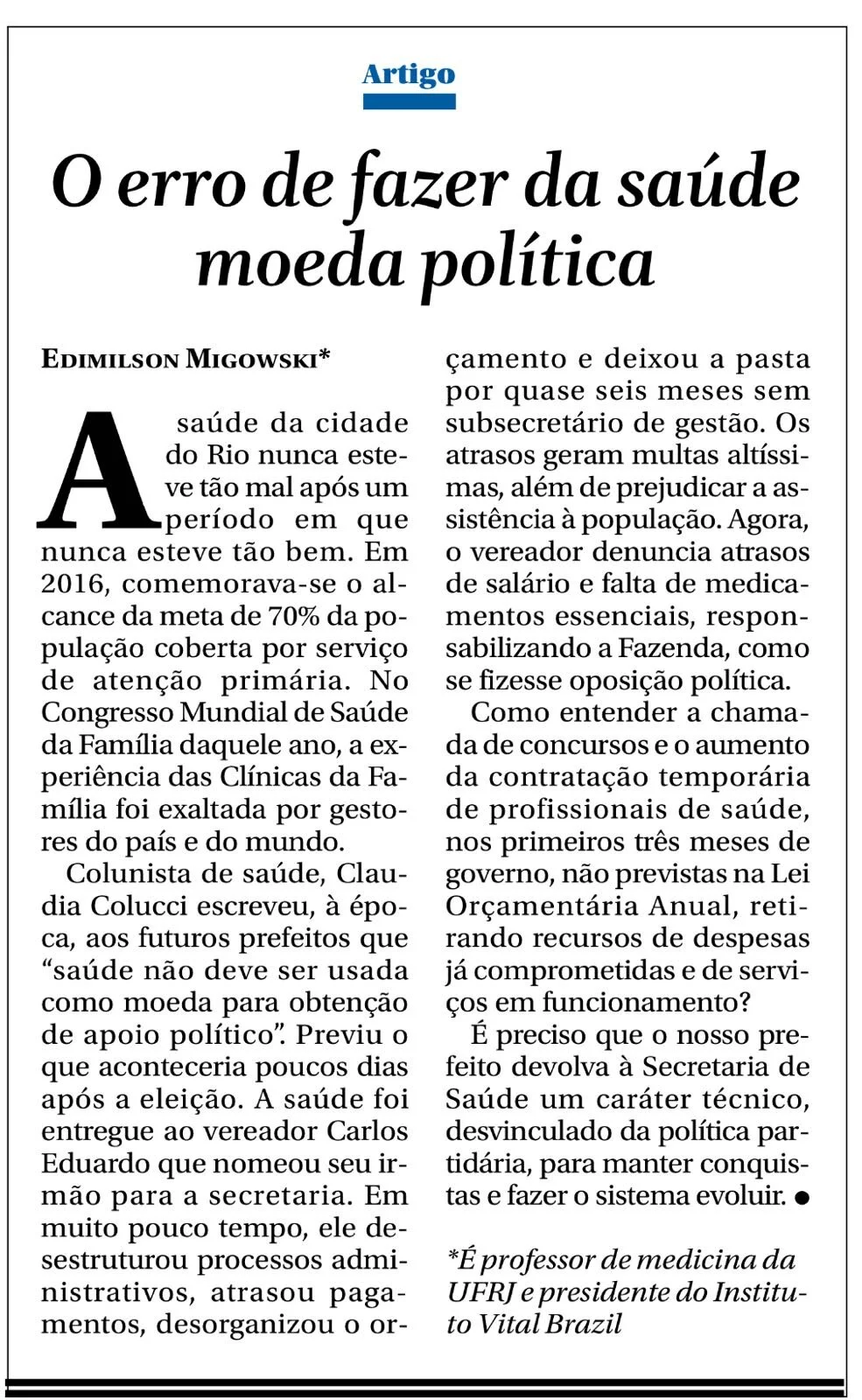 Tenho alertado quase que diariamente a todos sobre os equívocos do Governo Crivella, especificamente na área da saúde. Hoje o professor de Medicina da UFRJ e presidente do Instituto Vital Brazil, Edimilson Migowski, em artigo no Jornal O Globo, reconhece o trabalho desenvolvido pela nossa gestão e revela um pouco de como e porque, em tão tempo, um modelo de sucesso está sendo jogado no lixo.