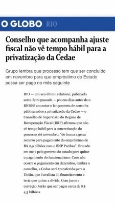 A situação é crítica. O governo publicou ontem um edital sobre a privatização da Cedae e proibindo novos gastos e aumento de salários de funcionários. Medidas que tinham que ter sido tomadas lá atrás. Mas agora é tarde. E não foi por falta de aviso.