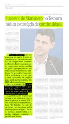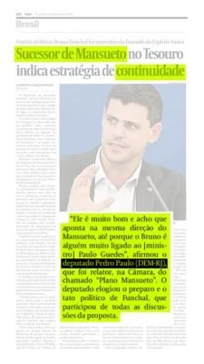 Para manter a continuidade do trabalho que vinha sendo feito pelo Mansueto à frente do Tesouro, a escolha do Bruno, sem dúvida, foi muito acertada. Ele ainda traz na bagagem a melhor experiência fiscal estadual, que é a do Espírito Santo, onde ele foi secretário de Fazenda, único estado com nota de crédito A. Além disso, o Bruno participou ativamente do Plano Mansueto e também das negociações para a ajuda aos estados.