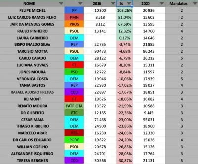 10. Ocaso do MDB. Com 429 mil votos a menos que 2016, MDB elegeu apenas um vereador – o menos votado.